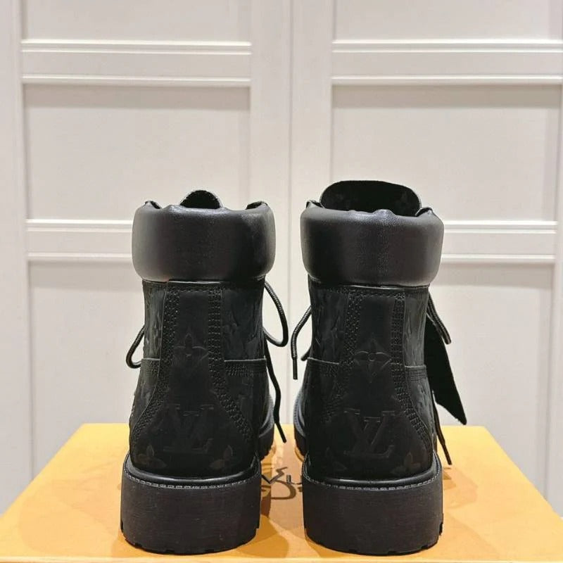 Louis Vuitton joins forces with Timberland to reimagine an urban classic. This special edition features the iconic LV Monogram embossed on premium black nubuck leather, blending the French maison’s luxury with Timberland’s legendary ruggedness. A padded leather collar ensures extra comfort, while hexagonal metal eyelets and reinforced laces highlight the utilitarian edge.
