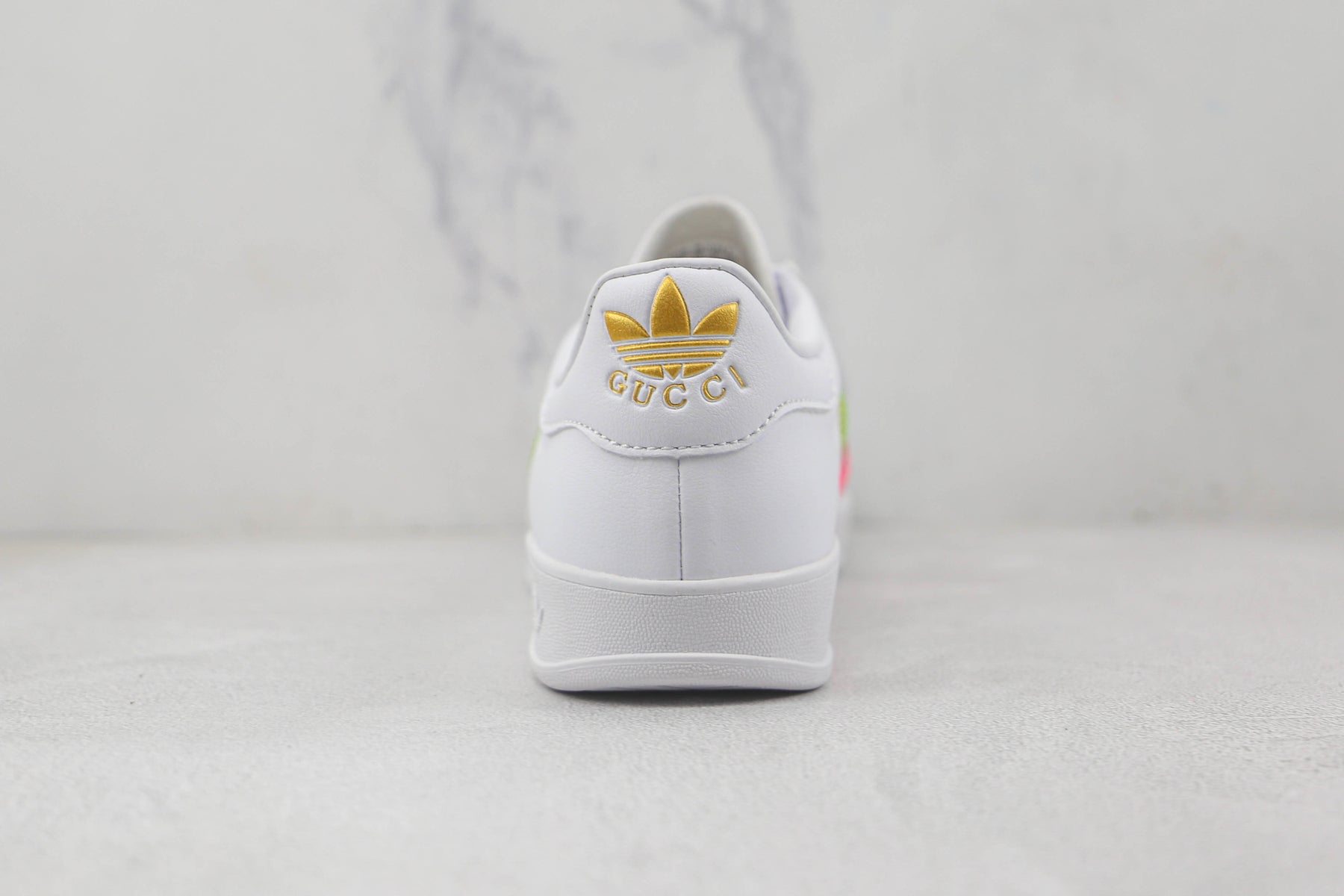 The Gucci Gazelle Sneaker – White/Multicolor reimagines the iconic Gazelle silhouette with a vibrant and playful twist. Set on a crisp white base, the sneaker is highlighted by three bold stripes in pink, orange, and neon green, paired with golden "GAZELLE" branding for a touch of elegance. Finished with premium detailing and crafted for comfort, this model captures the perfect balance between streetwear energy and luxury fashion