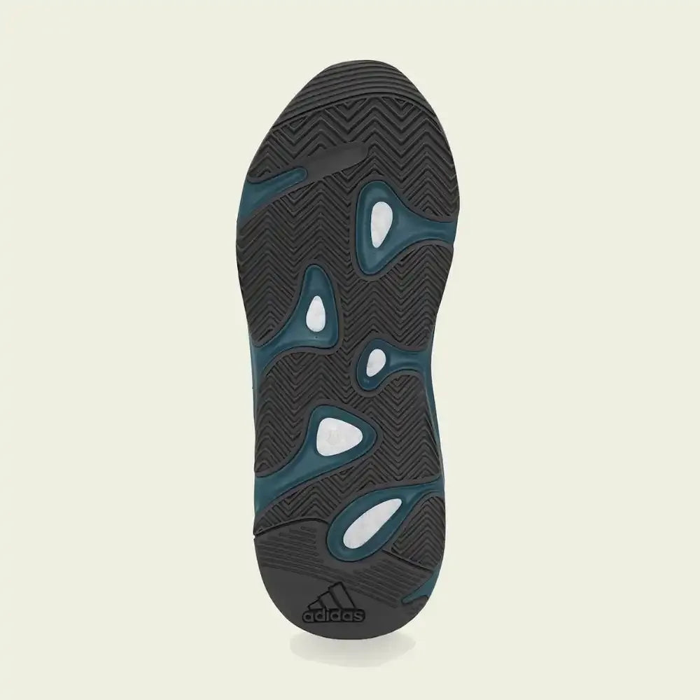The Adidas Yeezy Boost 700 V1 “Fade Azure” delivers one of the boldest takes on the classic chunky silhouette. The upper combines suede, mesh, and leather in striking shades of teal and aqua, contrasted by a deep blue midsole with bright orange oval accents for a pop of energy.