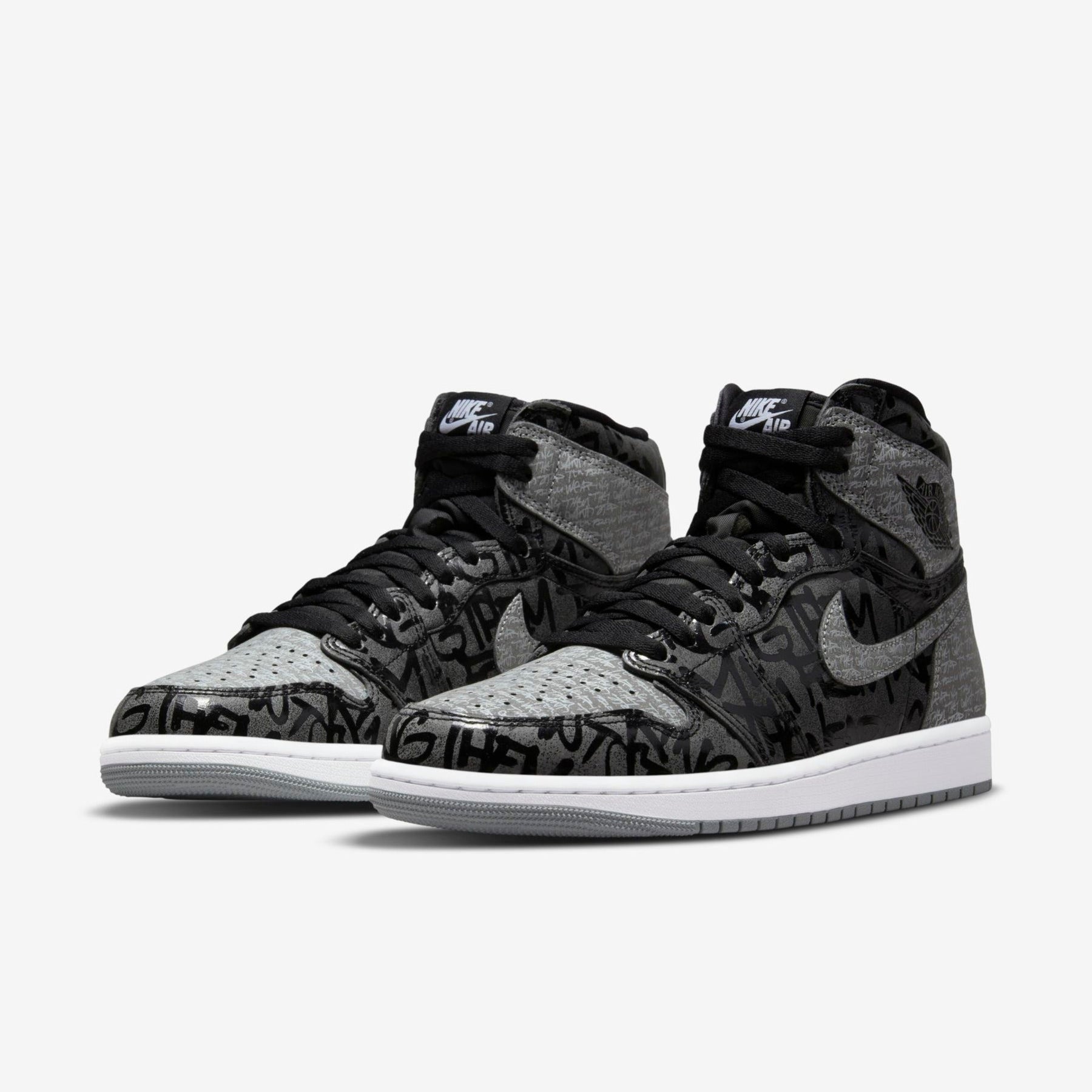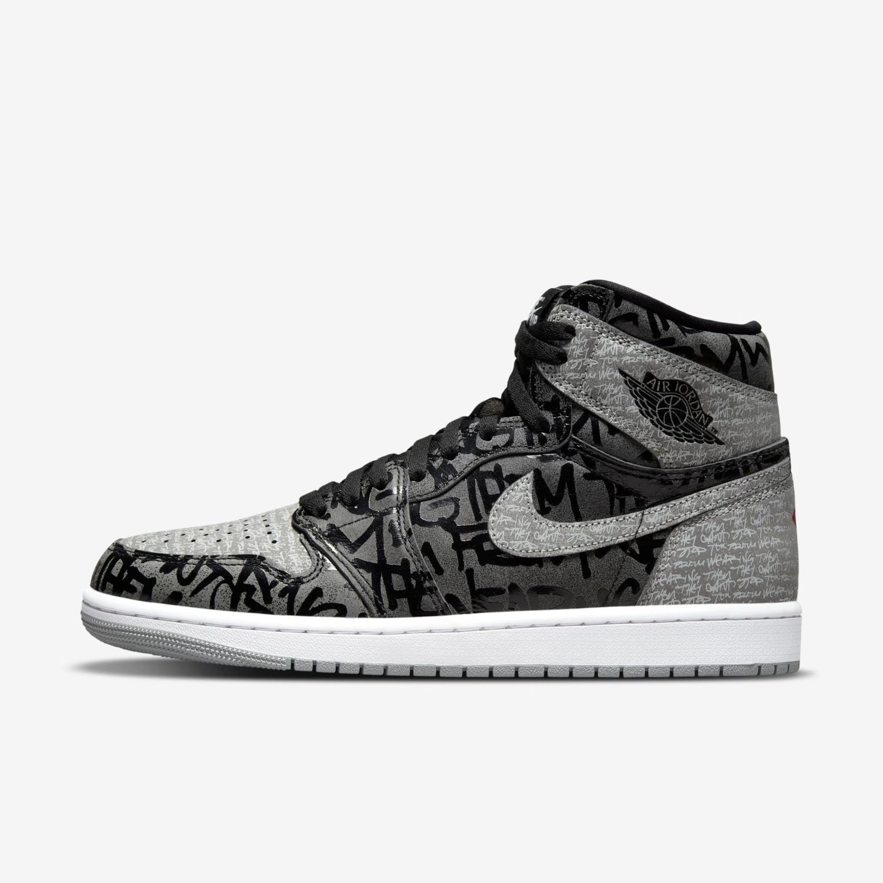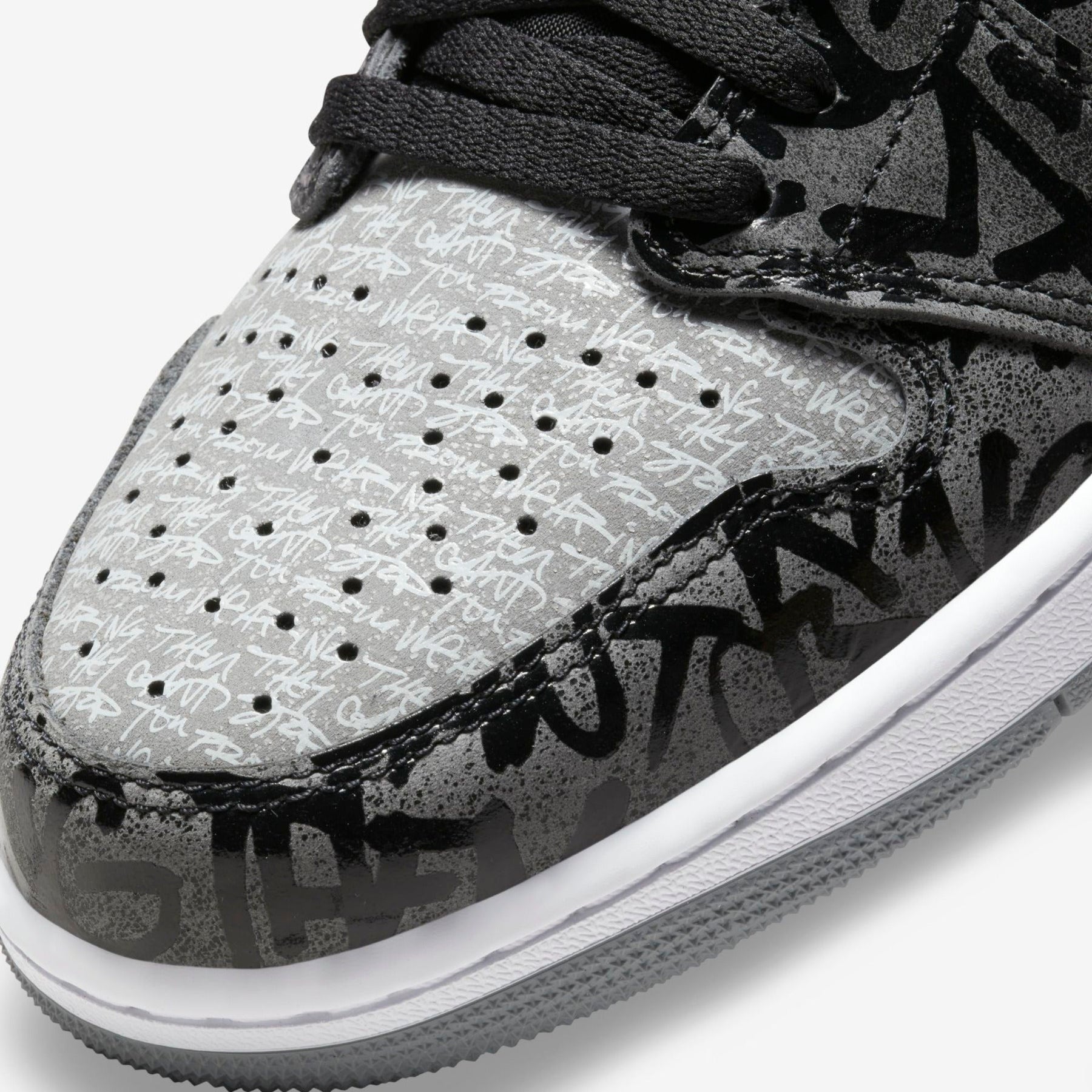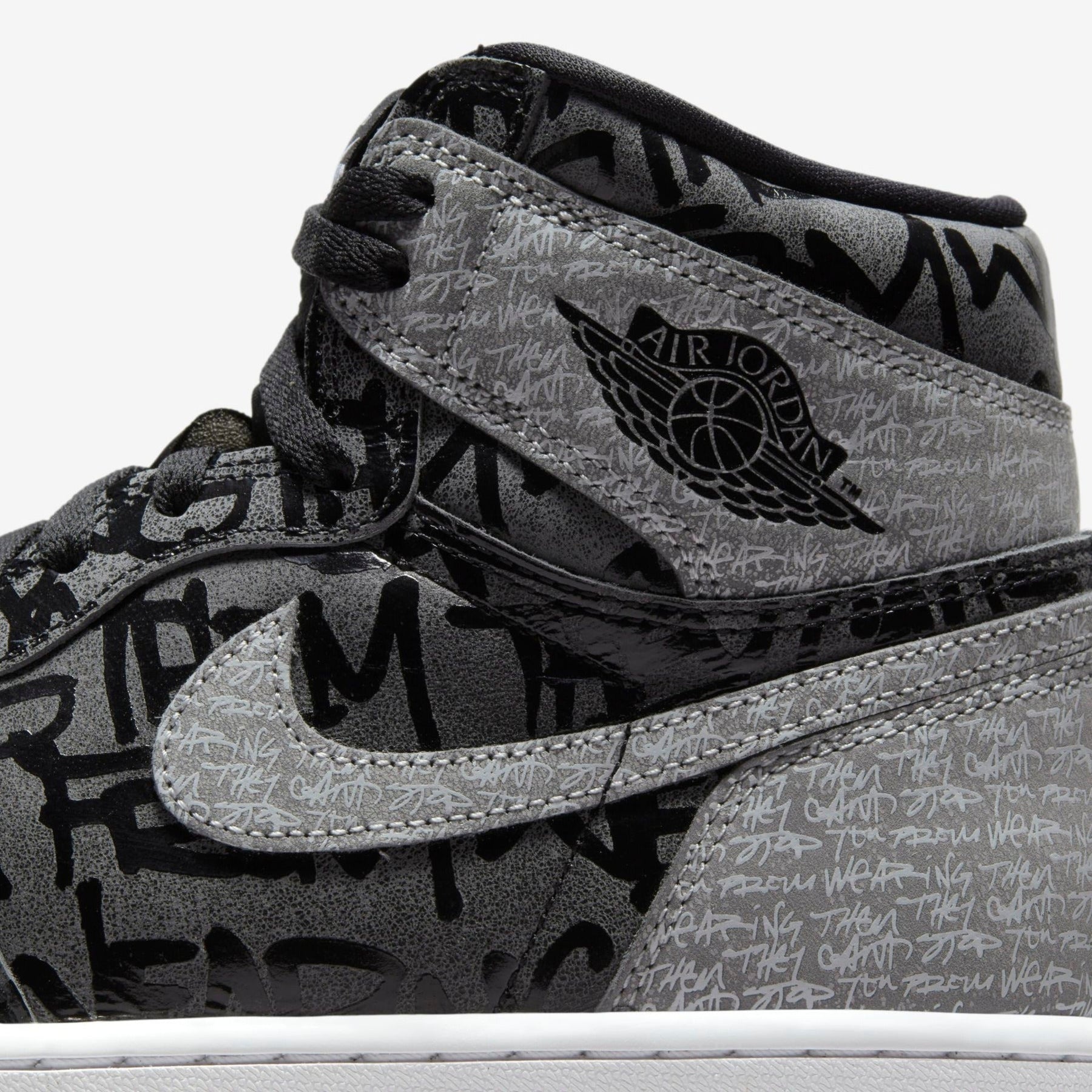 The Air Jordan 1 Retro High OG Rebellionaire is a bold iteration that pays tribute to the silhouette’s rebellious legacy. The upper comes dressed in black and grey with all-over graffiti-style text, featuring the iconic slogan “They Can’t Stop You From Wearing Them”—a nod to the original 1985 ad campaign. The standout detail is the large red “X” on the heel, symbolizing the NBA’s ban of the Air Jordan 1. A white midsole and grey rubber outsole complete this striking design