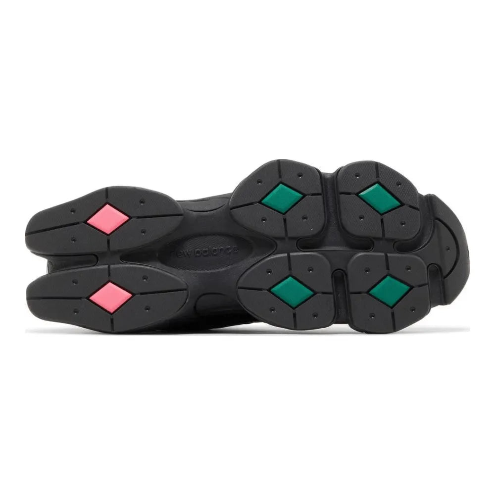 The Mowalola x New Balance 9060 “Burglarwear Teal” blends futuristic design with bold detailing. A breathable black mesh upper is reinforced with sleek black leather overlays, delivering durability and structure to the iconic silhouette. Striking teal accents highlight the lateral and medial “N” logos, forefoot, and eyelets, ensuring these statement sneakers turn heads with every step.