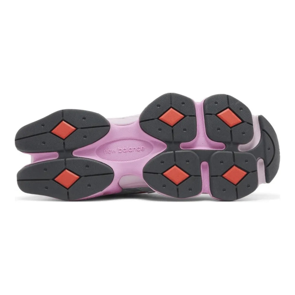 The New Balance 9060 “Warped” stands out with purple textile lines across a mint mesh upper, complemented by tonal leather and suede overlays. A yellow-and-orange “N” logo decorates the lateral side, while the opposite side features a stylized embroidered “N” in red and yellow. Fiery accents continue at the glossy TPU heel clip, adding to the bold aesthetic. Underfoot, lightweight comfort comes from a dual-density foam midsole in two shades of pink, delivering both cushioning and visual impact.
