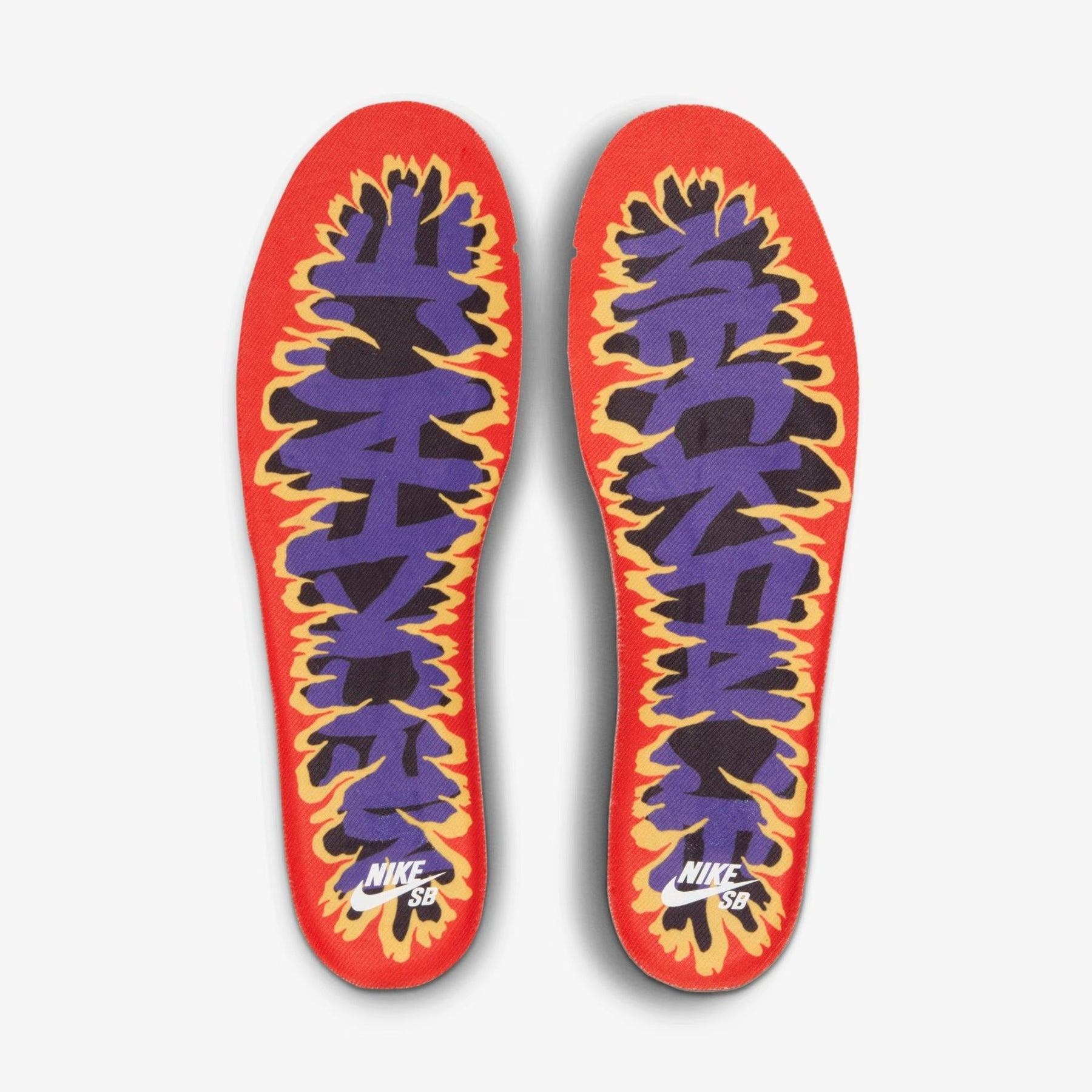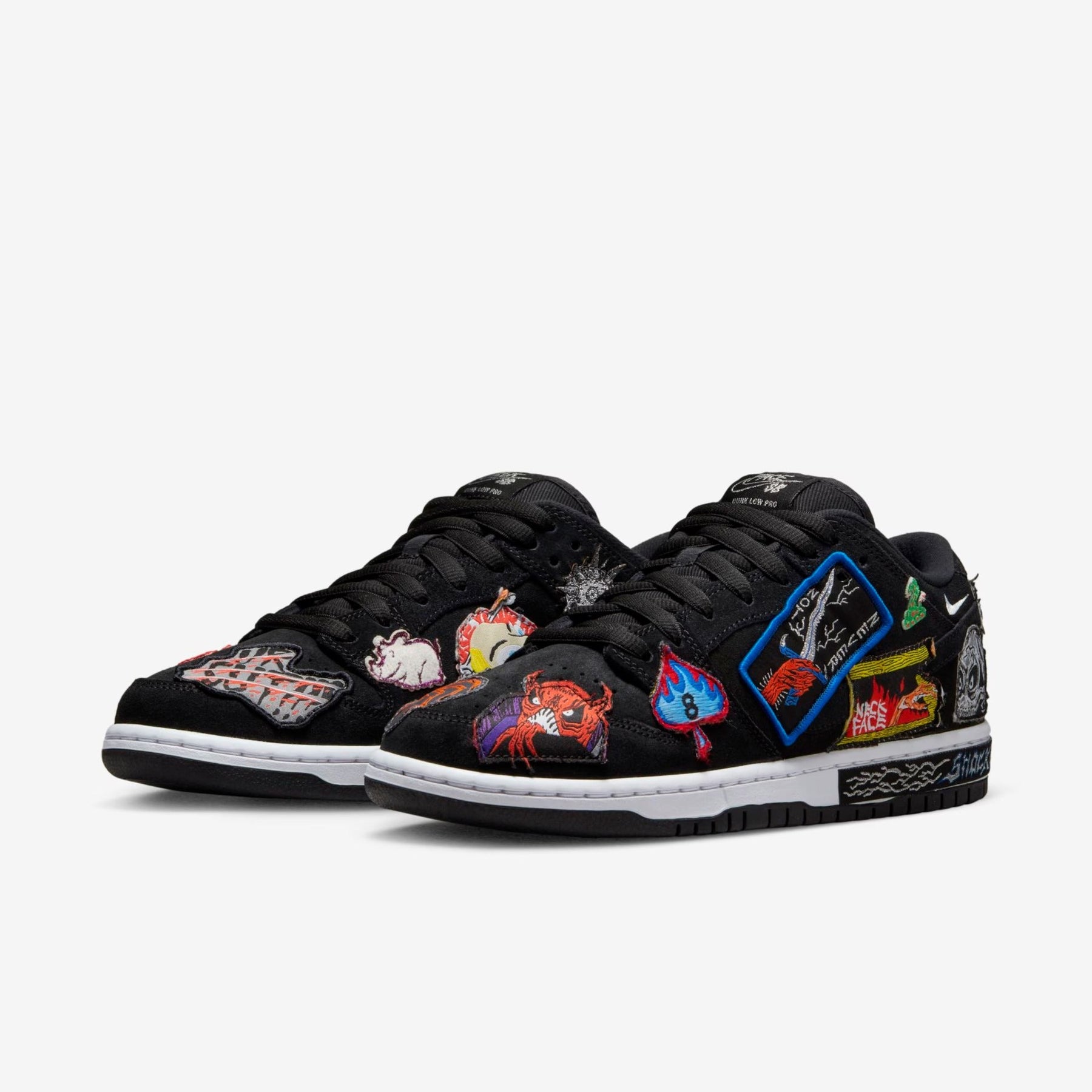Known for his dark sense of humor, skater and artist Neckface brings his heavy-metal-inspired aesthetic to the SB Dunk Low. A staple in both skateboarding and graffiti culture for decades, Neckface channels the “good side of bad luck” with a collage of patches pulled straight from the Grim Reaper’s sketchbook. Skulls, demons, and eerie slogans cover the black upper, turning every session into a hellish ride.